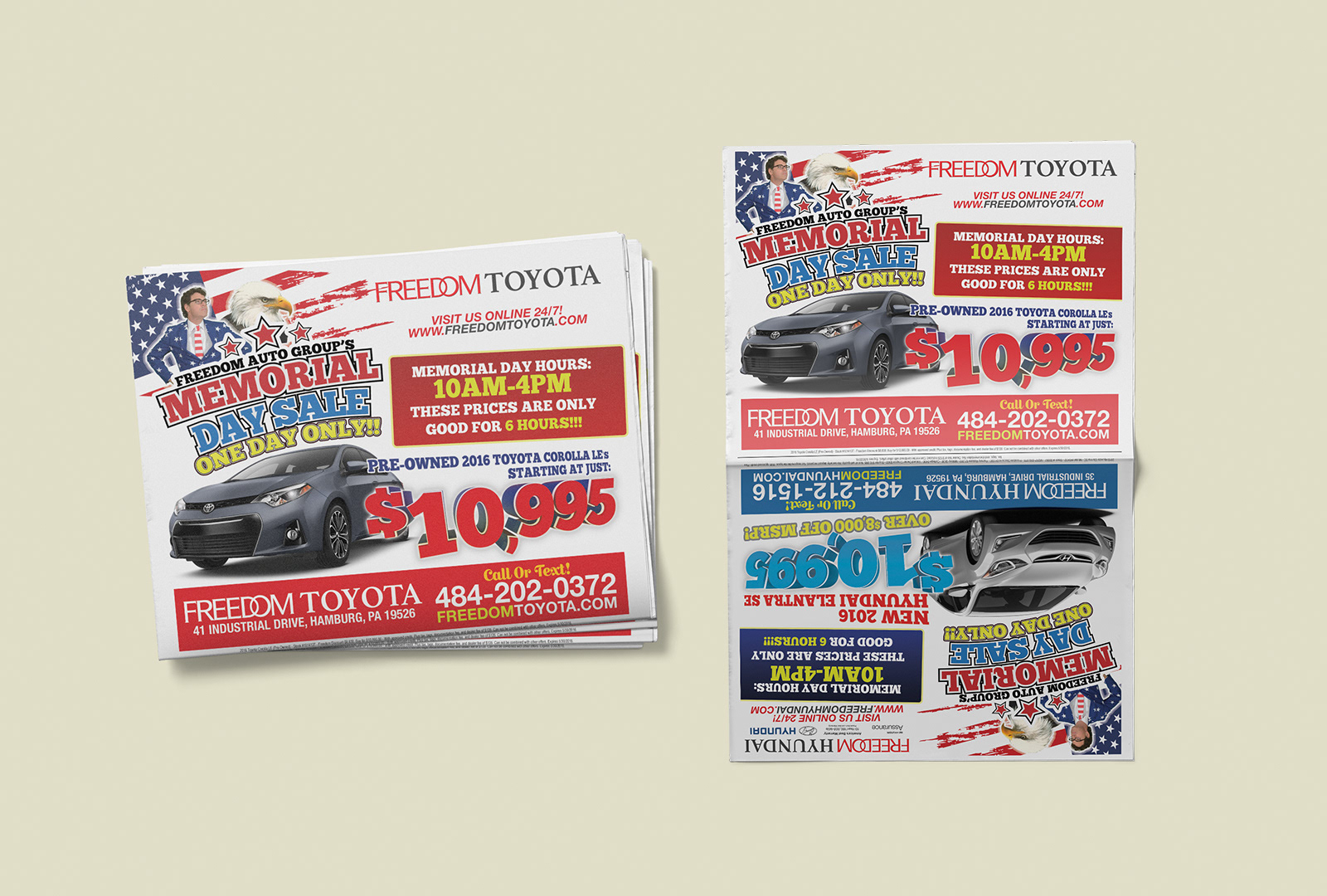 Freedom dealership’s main issue with its previous advertising was that it looked boring because his personal brand did not stand out from other competing dealerships. He wanted something unique for the upcoming Presidents’ Day sales event and mentioned that he would consider an extended contract depending on the campaign’s performance.